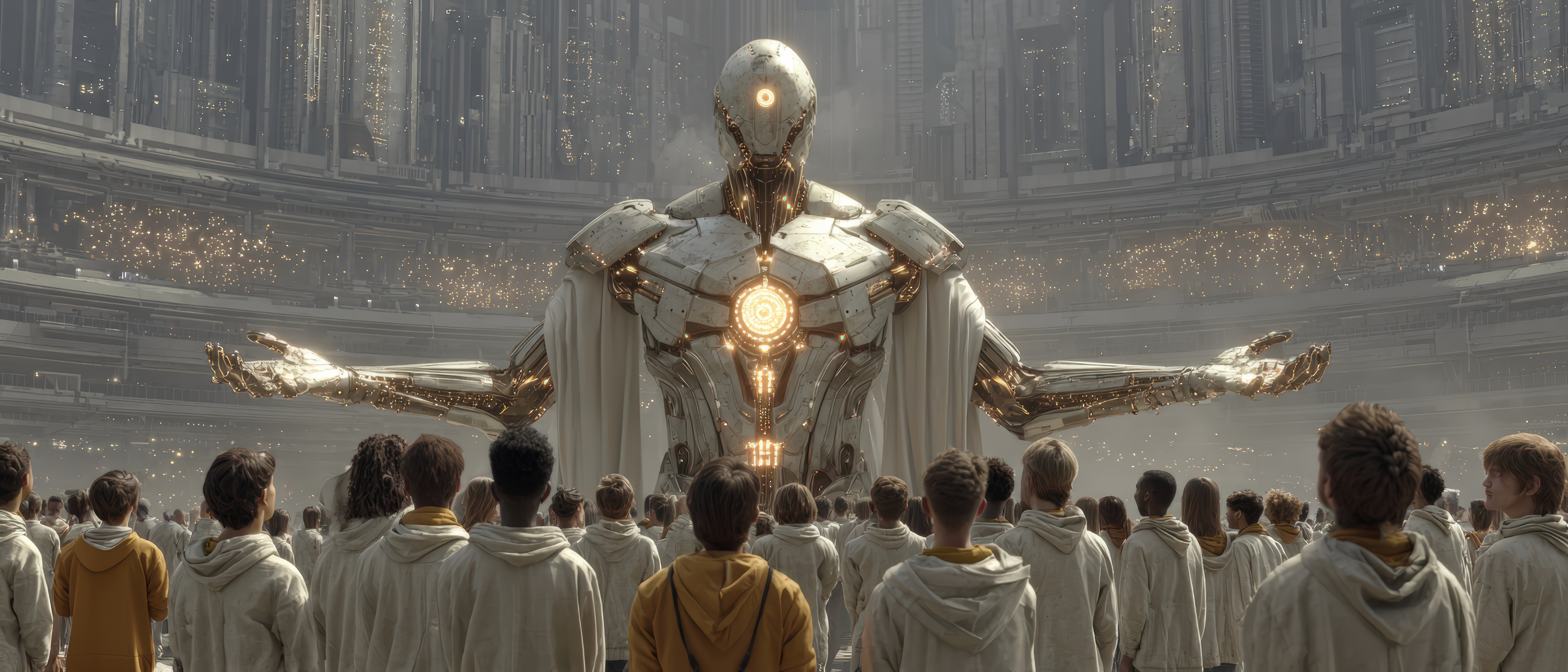 Imagine a new era — hearts and circuits live side by side. Towering megastructures stand as witnesses, where flesh and machine, soul and algorithm, move together in harmony. No longer divided, they share one world, forged in hope.